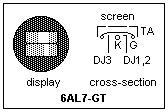 A curious kind of electron-ray tube is the 6AL7-GT. This tube was (they say) used as a tuning indicator in FM receivers, in which tuning was quite critical for good reception with early receivers. I never saw one, and do not know how they were used in practice, but the tube makes a fascinating example for study. The display is as shown at the left, which consists of two bars of greenish fluorescence, seen end-on to the tube. The internal structure is visible through the envelope, and a cross-section is also sketched. The cathode of the tube is horizontal (when the tube is vertical) instead of vertical, and only the electrons emitted upwards are used. There are beam-forming electrodes DJ1-DJ3 on either side of the cathode, below the grid. DJ3 extends over the whole width of both display bars, while DJ1 and DJ2 separately control the two bars on the other side. These electrodes are like the beam-forming electrodes in a beam-power tube, and have a similar action, which can be seen clearly here from the fluorescence. The grid seems to be a normal space-charge control grid, and was probably used to control the intensity of the fluorescence, as in a cathode-ray tube. The target anode TA accelerates and collects the electrons.