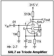The tube is also a triode, with the TA as plate. I ran characteristics for grid voltages from -1 to -6 V, and found μ = 43, rp = 370k, and gm = 120 μS. The low transconductance is to be expected, since only a portion of the emission is used, and the beam current is low. A voltage amplifier can be designed using the 6AL7, probably a service for which it never was intended. The example shown at the right gave a gain of -13 (it was supposed to be more like -19, but the parameters vary somewhat). The control electrodes were simply connected to the cathode, which gave wide bars, glowing softly with the beam current of 0.18 mA. The high plate voltage makes this an inconvenient amplifier, but it shows how any grid control can be used for amplification. This diagram also gives the pin connections for the tube.