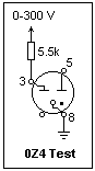 A curiosity is the 0Z4 gas rectifier. This tube, which is indeed a phanotron, has two plates and one cathode, really two diodes in the same envelope, as was typical for rectifier diodes intended for full-wave rectification with a center-tapped transformer secondary. It contains, I believe, argon gas at low pressure. The positive ions heat the cathode, as well as neutralize the space charge. The 0Z4 was used with vibrator power supplies for automobile radios, and had the advantage of not requiring a filament supply. A vibrator was a mechanical chopper that turned the DC from the car battery into AC that could be transformed to a higher voltage and rectified for the B+ supply. Solid-state replacements may now be obtained. The 0Z4 is guaranteed to break down below 300 V, and requires a current of at most 30 mA to keep the cathode hot. The circuit at the right can be used to test the properties of an 0Z4. The 5.5k resistance has to be 15 W; I used two 11k power resistors that I happened to have on hand. My 0Z4 broke down at 268 V, and had an operating voltage drop of 20-22 V, which seemed to fluctuate. When the voltage was reduced, the tube did not fall out until about 60 V, probably from too low a current to keep the cathode hot. These tubes produce a large amount of RF noise, and so are shielded to reduce it. My metal 0Z4 was silvery in color. The 0Z4 can be used with any power transformer from 250-0-250 to 300-0-300 volts. It requires at least 300V for breakdown, and the peak inverse voltage is 800 V. The current should be between 30 mA (minimum) and 90 mA (maximum).