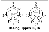 A famous beam power tube was the type 807, a graceful large tube with an ST envelope and a plate cap, shown in the photograph at the right. It appeared with a 12.6V heater as the type 1625, known in military service as the VT-136 and used in many military radio sets as an RF power amplifier. These days, it is considerably cheaper than the 807. With 30W plate dissipation, the 807 or 1625 could deliver well over 100W RF power when used in push-pull, operating at full ratings up to 60 MHz. These tubes also could handle heavy-duty audio amplification. The basing of the 1625 is shown below on the left. For some reason, it used a rare 7-pin base instead of the standard 5-pin base of the 807. The internal construction can be glimpsed at the bottom of the plate, and the beam-forming electrodes, as well as the aligned grid wires, can be seen. It is noted in specifications that the plate did not glow when the tube was used within its amateur (ICAS) or commercial (CCS) ratings. If a plate gets hotter than when it was outgassed at the evacuation of the tube, it may emit gases and ruin the tube.