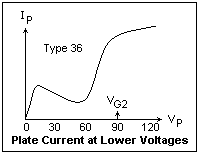 Although tetrodes worked as expected, they had a serious defect. It happens that speedy electrons colliding with the plate knock out secondary electrons. In a triode, these are rapidly sucked back to the positive plate, and the same happened in a tetrode when the plate potential was higher than the screen grid potential. In normal operation however, especially with large voltage gain, the plate voltage has a large swing, and can become less positive than the screen grid. Now all these secondary electrons (and some of the primary ones, too) are attracted to the screen grid, and there is a definite sag in the characteristic in this region. To prevent this, it is necessary to establish an electric field at the plate that is always directed toward the plate, to suppress the escape of secondary electrons. This is provided by a third grid, the suppressor grid, which is usually connected to the cathode. The tube with three grids: control, screen and suppressor, or grids 1, 2 and 3, is called a pentode, which turns out to be a superior voltage amplifier, fully equivalent to a transistor. A typical small pentode, the 6SJ7, has a plate resistance of over a megohm, and a transconductance of 1.6 mS.