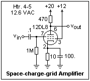When 12 V became the automotive standard, vibrator supplies or their solid-state equivalents, could still be used. Tubes with 12.6 V heaters were already common. Many had the heater center-tapped, so they could be used equally well on 6.3 V. However, 12 V is high enough to be used directly as the plate supply if the tubes are specially designed. A range of tubes was produced that could be used on 12 V only, without any high voltage at all. We have already discussed the 12DL8 and 12K5 space-charge-grid tetrodes, and how the space-charge grid allows larger plate currents for small plate voltages. There were approximately 15 tube types designed for 12V use, of which only three, the 12DL8, 12DS7 and 12K5 are space-charge grid tetrodes, behaving like triodes. The other tubes are of conventional construction, in general having low plate currents, less than 1 mA in many cases. These include twin-diode triodes (12AE6, 12FK6, 12AJ6), sharp cutoff pentodes (12AF6, 12BL6, 12CX6, 12EK6), remote cutoff pentodes (12CN5, 12DZ6), twin-diode remote cutoff pentode (12F8), pentagrid converter (12AD6), pentagrid (variable gain) amplifier 12EG6, and a twin-diode power screen-grid tetrode, 12J8. The last tube can deliver 20 mW output power, half of what the 12DL8 can do.