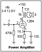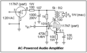 This amplifier makes a good construction project if you would like to have a small vacuum-tube amplifier at low cost, no more than $35 or so. Build it in a 6 x 4 x 2 aluminum chassis, add a volume control and on-off switch, and use RCA connectors for input and output. The 117N7 costs $6.60 currently, the filter capacitor about the same. Note that it will not be a sensitive amplifier, but it should work with a transistor radio earphone output or such. Unlike a transistor amplifier, it will take some time to "warm up" when it is turned on.
