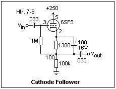 I found the voltage at the plate to be 59.3V (showing that the bias is satisfactory), and a gain of -17, at 1 mHz. The cathode bypass capacitor looks into the 1/gm resistance of the cathode (about 333Ω here) in parallel with the 1.5k cathode resistor. The low-frequency 3dB point is, then, f = 1/2π(272Ω)(100 μF) = 5.9 Hz. The gain was still -17 at 20Hz, the lowest frequency at which it was convenient to measure the gain. At the high-frequency end, the gain begain dropping at 400 kHz, and was 3dB down at 450 kHz. This was not due to failure of the electrolytic bypass capacitor at this frequency, because an 0.1 μF capacitor in series had no effect. The input capacitance of the 6SN7 is only 2.2 pF, but the grid-plate capacitance of 4.0 pF is multiplied by the gain (Miller effect) of 17, so the effective input capacitance is 2.2 + 4 x 17 = 70.2 pF. If my signal generator has an output impedance of 600Ω, this would mean an upper 3dB point of f = 1/2π(600Ω)(70.2 pF) = 3.8 MHz. Since we are already 3 dB down at 450 kHz, some other factor is spoiling the high-frequency end of the passband. Still, a gain of -8 was measured at 1MHz.
