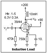 If you replace the 10 mH choke by a resistive load, you can see how the circuit would be affected. Now there is a voltage drop in the load resistor, so it is limited to about 33k if the plate current is 4.8 mA (obtained by a 510Ω cathode resistor), and the gain to about -33. If you try to overcome this by using a small plate current, say 1.6 mA (cathode resistor 4700Ω), then a larger resistor, say 47k, could be used. However, the gain would now be only -9.4, since the transconductance is so much lower. A remote-cutoff pentode is not suitable for low-plate-current voltage amplifiers--a sharp-cutoff pentode should be used instead, or even a high-mu triode. However, the remote-cutoff pentode is just the thing for reactive or transformer-coupled loads, since these do not reduce the plate voltage. It is very satisfying to be able to compare the behavior and use of remote-cutoff, sharp-cutoff and power pentodes.