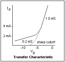 Typical characteristic curves are shown at the right; just three curves give a good idea of how the tube behaves. For the 6SN7, find the plate characteristics for grid voltages of 0, -1, -2, -3 and -4 V, up to plate voltages of about 120V. I found μ = 22 (at 7 mA plate current), gm = 2.9 mS (at 90V plate voltage), and so rp = 7.6 kΩ, quite close to the published values. These values are not constant, of course. Verify that μ = gmrp. Find the cutoff bias for some value of plate voltage. Since this point is not definite, it is usually defined as the voltage at which the plate current drops to some small value, say 10 μA.