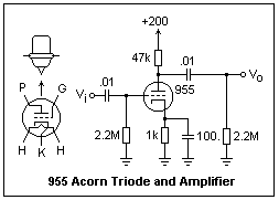 The amplifier shown gave a voltage gain of G - -40, with an input of 0.4V peak-to-peak. The plate current was about 100 μA, which made the plate voltage 77V and the grid bias -0.26V. The bandwidth of the amplifier was quite good, roughly from 10Hz to 50kHz. It should be noted that the total power drain of this circuit is no more than 83 mW, of which most is the filament power. This is very economical for a normal-sized tube. The tube remains quite cool in service, incidentally.