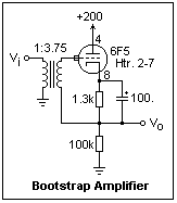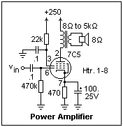 A power amplifier using a beam-power tube is shown at the right. The 7C5 is the loktal equivalent of the 6V6 or 6AQ5, to which it is electrically very similar. The screen is supplied through a series resistor from the plate supply, with a bypass capacitor, a typical arrangement. 470k is the maximum recommended grid-circuit resistance. At quiescence, the plate voltage was 248 V, the screen voltage 227 V, and the cathode voltage 13.35 V. The gain was -16 at 600 Hz, but increased with frequency to about -28 at 2 kHz, a result of the changing impedance of the loudspeaker. This difficulty is completely solved by the use of negative feedback to set the gain. This amplifier produced an output of about 1 W for a 12 V peak-to-peak input, enough to produce a very loud sound.