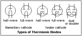 Signal diodes always have indirectly-heated cathodes, so they are easy to use. It is only necessary to make sure that the heater-cathode voltage does not exceed specified limits, usually a few hundred volts. Rectifier diodes often have filamentary oxide-coated cathodes, since these cathodes are more efficient when large currents are needed, requiring less power. We are considering only vacuum diodes, kenotrons, in this section. Thermionic gas diodes, or phanotrons, will be treated below, since they have rather different properties.