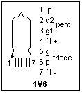 A sketch of the 1V6 and its connections is shown at the right. On the press seal, there is a red dot that identifies what I have called pin 1. The filament is located at the center of the tube, with the pentode on one side and the triode on the other. The triode shows a μ of about 10, rp = 18.6 kΩ, and gm = 440 μS. The pentode has gm as high as 694 μS above 500 μA plate current, but it drops considerably at lower plate currents. The two devices can be tested as usual, taking care not to exceed 45V or 1 mA. Note that the pentode and the triode share the same filamentary cathode.