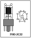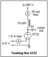 An available noise diode is the 5722, whose basing is shown at the right. The 7-pin miniature tube was made as late as 1977, and now costs about $14, which is probably not much more than when it was new. The maximum plate voltage is given as 200 V, and the maximum plate current as 35 mA, so apparently the plate can dissipate 7 W. The plate has wings that make a good dissipation probable.