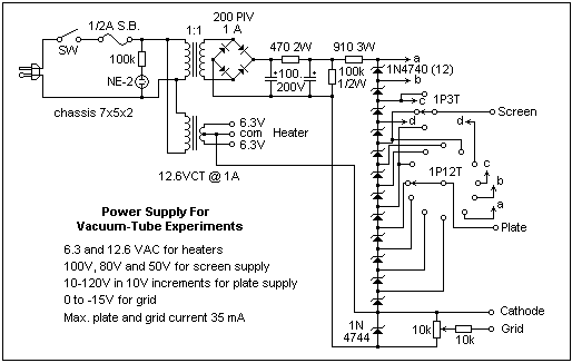 An all-in-one economical supply for vacuum-tube measurements is shown below. It uses an inexpensive isolation transformer from All Electronics, and can be made for about $30.00. The most expensive single part is the aluminum chassis. The grid potentiometer could be a precision 10-turn pot, but this would be expensive, and an ordinary carbon or plastic potentiometer (1/2 W or better) will be satisfactory. The maximum plate voltage of 120V and maximum plate current of 35 mA is adequate for many measurements. If you use a three-wire line cord, ground the chassis to the green wire. If you use only a two-wire line cord, it is probably better not to ground the chassis.