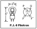 A thyratron is a gas-filled (argon at about 0.5 mmHg) triode, with a thermionic cathode ("thyra" is Greek for "door"). When the grid is held negative, it prevents conduction until the anode to cathode voltage is greater than some critical value that is linearly dependent on the grid voltage. The device acts similarly to a silicon controlled rectifier, except that it is voltage-controlled. Once conduction occurs, the grid loses all control, and the anode circuit must be opened to stop conduction. The 884 is a small thyratron for general use. The peak anode voltage is 300 V, and the peak anode current is 300 mA, but the operating current is 2 mA or less. A resistance greater than 25k must be in series with the grid to prevent excess grid current from flowing. The heater takes 6.3 V at 0.6 A (about twice the usual heater current).