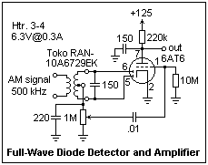 A full-wave diode detector is shown at the right, using transformer input. The 6AT6 is similar to the 6AV6, but its mu is 70 instead of 100. The transformer is a Toko RAN-10A6729EK, available from Digi-Key. It is specified as 0.63 mH, and for 200 kHz. Adjust the signal carrier frequency until the tuned circuit resonates; in my case, this was 500 kHz. For an input signal from the signal generator of 0.18V peak-to-peak (modulation amplitude 0.04V), I got 26V peak-to-peak at the plate of the 6AT6. The RF ripple was negligible, but there was some 60Hz pickup, not surprising with a high-gain breadboarded circuit out in the open. It was interesting to show the AM signal and the audio output simultaneously on the oscilloscope.