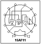 An example of a compactron is the 15AF11, a dual-triode pentode, making use of all 12 connections, as shown at the right. The heater takes 13.7V at 0.45A, and seemed to work satisfactorily with a 12.6V transformer. The triodes are not symmetrical. Unit A has μ = 72, gm = 3.8 mS, while Unit B has μ = 48, gm = 3.2 mS (by test; these are not the advertised values). The pentode Unit C showed the typical tetrode dips at low plate voltages. The transconductance was 5.9 mS at 8 mA, 4.9 mS at 5 mA, and 3.5 at 3 mA. The plate resistance was 60 kΩ at 10 mA, 130 kΩ at 7 mA (all by measurement).