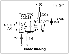 The rectified signal voltage is of the correct polarity to provide grid bias for the amplifier tube in this circuit. Therefore, the grid of the triode can be connected directly to some point on the diode load resistor that provides the proper bias, in place of the volume control potentiometer and coupling capacitor shown above. This arrangement is called diode bias, illustrated by the circuit at the left. AVC is essential when diode bias is used, to keep the bias voltage in the proper range. The audio signal, of course, rides on the bias connection. Diode bias is not suitable for high-mu triodes such as the 6AV6 or 6AT6, since they are very sensitive to the bias level. The 6R7 is a medium-mu triode (μ = 16). The 6SR7 is a single-ended equivalent, and will also work in this circuit. The signal generator should be adjusted to peak the output, at 455 kHz. I obtained an audio output of 13 V peak-to-peak with a 30% modulated AM signal of 0.2 V peak-to-peak, for a gain of about 289. The tuned circuit provides a large part of this gain.
