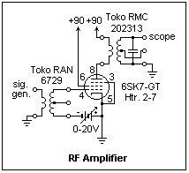 An RF amplifier using a 6SK7 remote-cutoff pentode is shown at the left. You could also use the miniature 6BD6, which is a little less expensive, or the 6-pin base type 78, the prototype for these tubes. The 6SK7-GT is very well shielded, with a Cgp = 0.005 pF, which makes the Miller effect negligible. Note that the grid bias can be varied. The purpose of this is to show the variable gain of the amplifier. In a radio receiver, the grid bias is supplied by the AVC (automatic volume control) circuit, and is the dc value of the rectified signal at the detector (see below). The gain of this amplifier is near -100 for zero bias, decreasing to -8 at a bias of -12V. Adjust the frequency of the signal generator for maximum output. Since this circuit has only one tuned circuit, there is no problem with alignment. Measure the gain of the circuit as a function of grid bias. The decrease of gain is practically linear up to about -8 V, but then begins to curve over rather than decreasing abruptly to zero. If we assume an ideal linear dependence, then the output signal is limited at the value that gives the cutoff bias. In a practical case, the amplitude of the output varies slowly with the amplitude of the input. If the input signal is weak, we get the full gain of the amplifier. Note that the only components in this circuit, besides the tube, are the two air core transformers. A practical circuit would have some other components, but this circuit shows the principle at its simplest.
