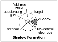 The construction of an electron-ray tube is shown in cross-section at the right. The target is a part of a cone of an angle of about 100°, 22 mm in diameter at the top, 8 mm in diameter at the bottom, and 5 mm high. A cathodoluminescent coating on the inside of the target creates an annular ring of greenish light about 6 mm in projected width around the 9 mm diameter light shield. The cylindrical cathode thimble is at the center, with heater inside, and is surrounded by a helical accelerating grid that acts just like the screen grid of a tetrode to create the target current of a few milliamperes. At one side is a ray-control electrode, a flat metal strip insulated from the other components. The electrons are accelerated from the space charge region by the accelerating electrode, and then pass into a nearly field-free region where they drift in straight lines to the target, creating light when they strike the phosphor.