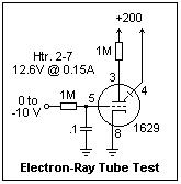A circuit for testing an electron-ray tube with a triode in the same envelope is shown at the left. The 1629 is recommended, as the cheapest and most widely available electron-ray tube. It operates exactly like the 6E5 and similar tubes, which are expensive and should be left to radio restorers. It is an attractive tube, and the internal construction can be seen clearly. Notice especially the continuation of the triode plate as the ray-control electrode. 200 V is required for proper operation, though voltages down to about 100 will give some result. My tube had a bright sector of only about 60°, though the rest of the target was faintly illuminated. The shadows of the support wires for the light shield were evident, showing the straight-line path of the electrons. When the north pole of a magnet was brought close, the electrons were deflected clockwise as seen from above, showing that they are negatively charged. The bright sector disappeared with zero bias, and closed for a grid voltage of -5.6 V. For even lower voltages, the bright sections overlapped, so the detection of this bias is rather sensitive. In this case, the ray-control electrode was obviously effective in accelerating electrons. A triode plate current of about 200 μA is required to bring the plate near ground, while -5.6 V cuts off the triode and the plate rises to the positive supply voltage.