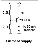 A circuit for testing the 5722 is shown at the left. Note that an RF choke is put in the plate lead to act as a load for the current fluctuations. This choke should be rated for the plate current employed. I connected a variable DC supply to the filament as shown, to pins 3 and 4, leaving the center tap alone. This supply should be rated at 2 A or more. Increase the filament voltage gradually, looking for the glow. There will be no plate current until the filament current reaches about 1.3 A, but it increases very rapidly beyond this point. The filament glows brilliantly, like an incandescent lamp, since its operating temperature is about 2400K, not the 900K of an oxide-coated filament. The filament current should not be allowed to exceed 1.6 A. If the power supply has current limiting, it can be useful here. By setting the plate voltage at near 200 V, you can see the saturation current as a function of filament current.