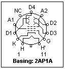 The basing for a 2AP1-A CRT is shown at the right, looking at the pin end of the tube. Since the proper 11-pin socket is not easily available, connections can be made with 0.093" female spring receptacles designed for connectors (Digi-Key WM1105-ND). The CRT can be supported by a 1-1/4 x 1-1/4 x 1/2 PVC tee, the middle leg of which is 1/2 pipe, so a close nipple and floor flange will support the tee. I could not find the exact tee, so I used a 1-1/4 tee, and a reducer to 1/2 pipe. No pipe size exactly fits the CRT, but rubber or fiber pads can be used at both ends to support the CRT in the pipe. The leads are brought through grommets in the top of the chassis in shrink tubing. The heater, cathode, grid and focusing electrode are in one bunch (5 wires), ground and the deflection plates in the other (3 wires). One of the heater leads is connected to the cathode at the tube base. The accelerating anode, and one side of the deflection plates, are also connected together at the base. The portion of the tube from the deflecting plates to the screen is accessible, so that a solenoid can be slipped over the end of the tube for possible experiments, such as the determination of e/m.
