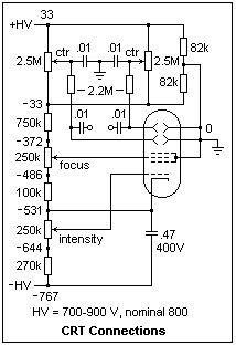 The circuit for a CRT is shown at the right. The circuit is slightly modified from one in the 1954 ARRL Amateur Radio Handbook. For a nominal high voltage supply of 800 V, the voltages at the nodes on the voltage divider are shown. Note that A2 and the deflecting plates have been brought near ground, while the cathode is at a large negative potential. All resistors are 1W metal-film, except for the two 2.2M resistors for the centering controls to the deflecting plates. An AC connection to the plates through 0.01 μF capacitors is shown; these should probably be replaced by 0.1 μF capacitors to pass lower frequencies. The focus and intensity controls are at high negative voltages, and must be carefully isolated from the operator. Good-quality controls are necessary, and they should be rated to resist the voltage. This circuit was designed for a 2BP1 tube, which has greater deflection sensitivity than the 2AP1. The 2AP1 was, however, considerably cheaper, and is quite satisfactory for our purposes.