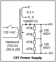 A power supply for the CRT is shown at the left. The maximum voltage across the 1W metal-film resistors is 350 V. They serve the dual purpose of equalizing the voltages on the filter capacitors and acting as a bleeder to discharge the capacitors when the supply is turned off. The two capacitors in series are equivalent to 50 μF, more than sufficient here, even with half-wave rectification, since the total drain on the supply is no greater than 1 mA, half of which is in the bleeder resistors. The low current also eliminates any problems with DC in the transformer secondary. The Hammond 270CAX transformer with a 500 VCT secondary gives 807 V on 120 VAC, 737 V on 110 VAC. Transformers are rated at full load, and can give significantly higher voltages at low loads. Note that two 1N4007 rectifiers are used in series, since the PIV is over 1600 V in this circuit.