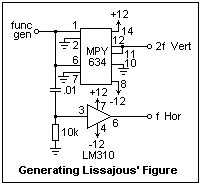 A Lissajous' figure is an interesting display for test purposes. The circuit at the left, using an analog multiplier, produces signals at f and 2f, with the f output phase-shifted by the RC network. I used an LM310 unity-gain follower to buffer the output, but any unity gain follower made with an op-amp will do. The gain controls on the deflection amplifiers could be used to make the shape of the figure the most pleasing. Varying the frequency will vary the phase shift, changing the figure. It is also possible to use two function generators, which will produce a moving pattern, and require close adjustment to get a simple figure that changes slowly. If you have only one function generator, construct any of the sine wave oscillators mentioned in the page on oscillators for the second source. Lower frequencies make easier adjustment. Try the triangle waves as well as sine waves.