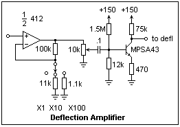 A deflection voltage range of about 150 V is required for the 2AP1A, which is easily obtained with the amplifier shown at the right, which uses a high-voltage MPSA43 NPN transistor. The quiescent collector voltage should be about 75 V. The gain of this circuit is about 150, so an input voltage around 1 V is sufficient, provided by a straightforward noninverting amplifier, whose gain can be set at 1, 10 or 100, giving sensitivity down to millivolts. The power supply for the op-amp should be bipolar, and ±5 V will do. Of course, two separate circuits are required, and you will get a useful X-Y scope with no further equipment. The provision of a triggered sweep is a special problem, that will not be attempted at this time.
