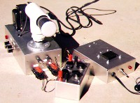 The cathode-ray tube oscilloscope is an experiment that I had thought was beyond the scope of these pages, mainly because of the cost and difficulty of obtaining the components. However, I built the oscilloscope shown at the right. The three parts are the scope itself, the deflection amplifiers, and the power supply for the deflection amplifiers. The CRT is still in widespread use, the most numerous survivor of the vacuum tube tribe, and has much intrinsic interest besides, so it would make a good laboratory exercise. Happily, it turns out to be quite possible to make an oscilloscope from scratch for about $100, which is not really a great deal these days. A CRT and a power transformer can be purchased from Antique Electronic Supply, 6221 S. Maple Ave, Tempe, AZ 85283. These are the two most expensive components, followed by the 5" x 10" x 3" aluminum chassis and the potentiometer controls. Because of the serious high voltage, a CRT should not be made on the breadboard, but properly constructed in a permanent form. Although CRT's are still widely used in oscilloscopes, the manufacturers seem to use tubes specially designed for them, while commercial types such as the 2AP1A are not produced, since people do not generally make their own oscilloscopes.