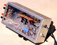The inside of my scope is shown at the left. The intensity and focus potentiometers are visible, as are the filter capacitors on the power supply board, and the wiring near the deflection terminals. The accelerating anode is at ground potential, and the cathode is at negative high voltage. Test your circuit at several stages before connecting the CRT by applying the AC voltage slowly with a variable transformer, starting at zero, while measuring the interesting voltages to see that they are correct, and not too high. Be very careful, since these voltages are dangerous. Connect the meters before turning on the power, so that all you have to do is read them, and do not make alterations with the power on. Note that it requires several minutes for the voltage across the filter capacitor to decrease to a safe level after the switch is turned off. All exposed metal should be grounded to the green wire in the power cord. Check this with an ohmmeter.