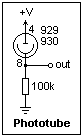 The basing for phototubes is shown at the right. These connections apply to nearly all phototubes with octal and small 4-pin bases, including the 1P40/930 gas and the 1P39/929 vacuum phototubes that are typical. If there is a cap, it should be obvious whether it is connected to the anode or cathode. The corresponding pin is then unused. The arrow shows the direction of incidence of light. The photocathodes for these tubes have a projected area 5/8" wide x 13/16" high, centered 1-5/8" above the seat of the base. The 1P39/929 has an S-4 cathode with maximum sensitivity at 400 nm, and is designed for photometry. The maximum anode voltage is 250V, the maximum photocurrent 5 μA, the maximum ambient temperature 75°C. The absolute sensitivity is 0.045 μA/μW at maximum, or 45 μA/lm for 2870K tungsten light. The dark current is 12.5 nA. The 1P40/930 has an S-1 cathode with maximum sensitivity at 800 nm, and is designed for sound reproduction and relays. The maximum anode voltage is 90V, the maximum photocurrent 3 μA (6 μA for anode voltages less than 70V), the maximum ambient temperature 100°C. The absolute sensitivity is 0.012 μA/μW at maximum, or 135 μA/lm at DC, 111 μA/lm at 5 kHz, and 101 μA/lm at 10 kHz. The maximum gas amplification factor is 10, and the dark current 100 nA. The voltages and specifications are quite typical of all gas and vacuum phototubes.