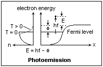 The valence electrons in metals are free to move about, but are confined to the volume of the metal by the potential well produced by the positive ion cores. This potential well is shown in the figure at the right, in the right-hand plot of electron energy versus distance, x. The potential well is a very deep one, so deep that it is amazing that electrons can be coaxed out under any circumstances. The key to the situation is shown in the left-hand plot of the number of electrons in the available states. There is not an infinite number of states, but a quite finite number, few at low energies and more and more at higher energies, the number of available electron states increasing as the square root of the energy. Electrons are curious in that only a pair of electrons at most can occupy any state, and this pair must have their spins opposite. The valence electrons fill up the states starting at the lowest energies, and continue upwards. At T = 0 K, all the states are filled up to some energy E called the Fermi level, shown in the figure. The electrons at the top have quite high energies, but still can't go anywhere. It takes an extra energy Φ, the work function, to allow them to depart. At finite temperatures, some of the electrons at the top are kicked up to higher levels, and this empties some states below the Fermi level, as shown by the dotted line. If the metal is made hot enough, some of the electrons may acquire more than the work function of extra energy, and leave. This, of course, is thermionic emission, as used in vacuum tubes.
