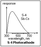 To be sensitive at the peak sensitivity of the eye, 550 nm, the work function of the photocathode must be less than 2.2 eV, and to be sensitive over the whole visual range of 400-700 nm, 1.8 eV. Only the alkali metals Na, K, Cs and Rb have such low work functions, and are the basis of most photocathodes, generally as alloys rather than as pure metals. Na and K are difficult to work with, so most use Cs and Rb. There was a search for photocathode materials with low work function, and at the same time a large quantum efficiency, which is the average number of photoelectrons emitted per photon of the incident light. Some of the most useful materials are the S-1 Ag-CsO-Cs cathode, sensitive out to 1200 nm with a peak near 800 nm, the S-3 Ag-Rb cathode, sensitive to 900 nm with a peak at 430 nm, and the S-4 Sb3Cs cathode, the most sensitive, with a peak sensitivity near 400 nm and a maximum wavelength of 700 nm, sketched at the left. The S-1 photocathode appears silvery and somewhat pink, the S-4 grey. There were some 16 different cathode responses, most only used on a small number of devices. Cathodes like the S1 and S4 are not really metals, but complicated semiconductors that can have low work functions. The quantum efficiency of a photocathode is the average number of photoelectrons per quantum absorbed. For an S-4 cathode, it can be 0.1 at the maximum sensitivity. For the S-1 cathode, the efficiency is much lower, perhaps 0.004.