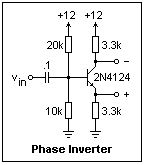 There are two convenient methods of phase inversion (in addition to the differential amplifier). The first depends on taking the outputs from resistors carrying the same current, which is controlled by the input signal, so that the phases are opposite. There is no voltage gain in this kind of phase inverter, so a preceding voltage amplification stage is usually required. A transistor phase inverter is shown at the left. The circuit is often called a paraphase amplifier. It should be biassed so that there is sufficient "headroom" for the two ouput signals. As the emitter voltage increases, the collector voltage decreases, and the limit is set when they collide, saturating the transistor. In this circuit, I have allowed about 5 V between collector and emitter when resting, which allows a peak-to-peak output of about this amount. The bias divider could probably be increased in value by a factor of 10 if a higher input impedance is required.