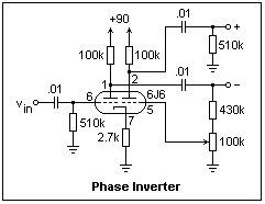 The second method, more commonly used with vacuum tubes, uses a separate inverting amplifier to create the antiphase signal. There can be considerable gain in this kind of phase inverter, so a preamplifier is not required. Also, there are no headroom problems when a considerable output amplitude is desired. A circuit is shown at the right that uses a 6J6. Note that the input to the grid of the phase inverter is taken from the output of the other triode, in the grid circuit of the following tube, where a trimmer potentiometer can be used to adjust the ouputs to exact balance. The gain of this circuit is about 21, so the resistance below the slider is set at about 25k. The plate currents of both tubes flow through the same cathode resistor. Since the signal currents are opposite in phase, no signal current appears across the cathode resistor, and it need not be bypassed. This circuit produces a 30 V peak-to-peak ouput with an input of about 1.4 V. The octal 6N7 can be used in an identical circuit, and can feed a second 6N7 as a push-pull power output stage giving 10 W. This combination was often seen, in things like small PA systems. The same idea can be used with transistors. However, the availability of complementary transistors eliminates the need for phase inversion in most cases.