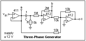 Three-phase is produced by the circuit shown at the right. Any op-amp can abe used, but 411's and 412's are shown. Here, both the phase shift and the amplitude are affected by the frequency, so the values of R and C must be chosen for the desired frequency. This RC circuit produces a phase shift of 60° when f = 1 / 2π√3 RC; about 60 Hz for this circuit. It is supplied by a buffer amplifier, which provides phase "a." The shifted signal is then multiplied by -2 to restore its amplitude and invert it, producing phase "b." Phases "a" and "b" are added and inverted by the third amplifier, and the result is phase "c." By careful adjustment of the gains and frequency, the balance can be made quite perfect, but it will be found good enough without any adjustments except for perhaps a slight change of frequency.