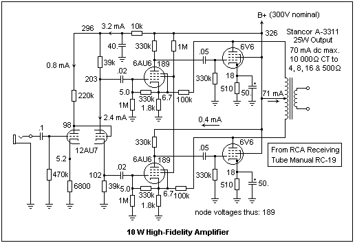 The input circuit, built around the 12AU7, has extra power supply filtering provided by the 10k resistance and 40 μF capacitor. The heavy fluctuating current demands of the output stage can affect the B+ voltage, and feed back to the low-level input stages if decoupling is not provided. The first half of the 12AU7 accepts the input voltage and translates it to a higher voltage with small gain. The unbypassed 6800Ω resistor provides stabilizing negative feedback. This circuit could be replaced by a simple voltage divider, but the triode gives better impedances and uses less current. The other half of the 12AU7 is a phase-splitter. When its grid rises in potential, the cathode follows. Note that the grid bias is about -4 V. The same change in current is felt by the other 39k resistance, and the plate falls by an exactly equal amount. These changes are of the order of a volt only, and are fed through the .02 μF capacitors to the grids of the 6AU6's. The plate voltages on the 12AU7 are also well within limits. The 6V6's are the only tubes exposed to high voltages, and they appear rugged enough to handle them.