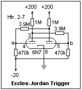 Finally we are ready to discuss the important circuit mentioned at the top of this page, the Eccles-Jordan, shown at the left. In it, the capacitors of the Abraham-Bloch multivibrator are replaced by resistors. These resistors pull up the grids of the triodes until both conduct, and this state of unstable equilibrium collapses into State 1 or State 2, depending on which triode remains conducting. Both states are persistent, and do not decay into each other. The grid resistors must be returned to a negative voltage of about -20 V for proper operation of the circuit. In this state, a negative pulse applied to the grid of the triode that is conducting causes a transition to occur. You can simulate such a pulse by touching a wire connected to ground to the proper grid momentarily. Like all mechanical contacts, this will bounce, but multiple pulses have the same effect as one. They are, in effect, "debounced" in this circuit, which is a set-reset flip-flop in modern terminology.
