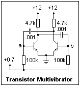 A transistor realization of the Abraham-Bloch circuit is shown at the left. It is almost exactly the same as the vacuum-tube circuit, except for one detail. If the base resistors were returned to ground, the circuit would not oscillate, since both transistors would be cut off. Unlike a vacuum tube, a transistor does not conduct with zero base-emitter voltage. When the bases are raised to the point of conduction, as shown, oscillation begins immediately. If the collector resistors are too small, the transistors will not saturate, and the circuit will not oscillate. The collector waveform is a square wave with a slow leading rise, and a sharp drop, with the full amplitude of 0 to 12 V. The bases are driven negative on each transition. In fact, this drive is large enough to worry about the base-emitter junction breakdown, though no problem was experienced here. The frequency was about 19 kHz with the component values shown. The collector waveform switched between 0 and 12 V, with a slow rising edge but a sharp trailing edge. There have been many circuit refinements to improve the waveform and other factors, but here we are only interested in seeing how it works.