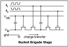 For delays in the millisecond range, between the ranges where recording or wave propagation are convenient, the Bucket-Brigade Device (BBD) may be useful. This is an NMOS or PMOS VLSI (very-large-scale integration) device that is essentially an analog shift register. Analog values are shifted from one cell to another by clock pulses. At the input end, the band-limited signal is sampled at the clock rate, and at the other the sampled values are made available at a later time. Low-pass filtering then restores the band-limited analog signal. These devices were first used to read out the analog values of a CCD (charge-coupled device) optical sensor. A line of pixels is transferred to the units of a BBD, and then shifted out serially. It was recognized that these devices could also serve as delay lines, so BBD's were manufactured for this specific purpose. They have the very great advantage that the delay time can be varied simply and electrically by changing the clock frequency.