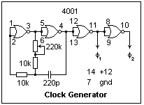 The two-phase clock signal can be produced with the relaxation oscillator shown at the left, which uses a 4001 CMOS quad NOR gate. This supplies clock signals of the full +12V amplitude. The duty cycle is not 50%, but the rise and fall times are satisfactory. The frequency is adjusted with the potentiometer connected as a rheostat. A 500k potentiometer would give a wider range, but 220k is what I had at hand. The circuit shown will produce a range of frequencies from 11 kHz to 185 kHz adequate for this experiment. Note that HC logic cannot be used because of its limited supply voltage.