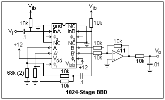 In the circuit at the left, the two BBD's are cascaded into one 1024-stage BBD. With the clock mentioned, the delay times are from 5.5 ms to 91 ms, and the input signal bandwidth is 11/3 = 3.7 kHz. Note how the ouputs of the A stages are grounded, and their average applied to the input of the B stages. The overall gain of this circuit is 0.5, which could be made +1 by changing the feedback resistor on the op-amp. Note how the op-amp sums the outputs into its virtual ground at the (-) input. These circuit have only a simple RC low-pass filter at the output to filter the clock frequency, and no input filter at all. In a practical application, more care should be taken in filtering the input and output, perhaps with higher-order filters.