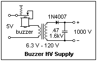 High-voltage power supplies have been mentioned here, and on the Cathode-Ray Tube page. A third alternative is shown at the right. This circuit can be put together very quickly if you happen to have an electromagnetic door buzzer available (this is one of the good things that are becoming unavailable). The transformer, a small 6.3 V, 300 mA device, is not insulated for high-voltage service, but seemed to survive well enough in this circuit. A high-voltage 0.47 μF capacitor was used as a filter, which discharges rapidly enough through a DMM that a bleeder is not necessary. For a practical circuit, the capacitance should perhaps be larger, and a 1M bleeder should be added. Remember that ordinary resistors can only take 250 V. Watch the input voltage carefully to make sure the output voltage does not rise too high; it is near the limit of the 1N4007 diode. Use two diodes in series if necessary. With a larger filter capacitor, the circuit becomes more dangerous, of course, and care should be taken with it. This circuit can give an appreciation for the size of inductive spikes. If the load is really low, such as a Geiger-Muller tube, the buzzer could be replaced by a pushbutton that is pressed enough times to build up a voltage. The diode can be replaced by a spark gap, since only voltages in the correct direction are large enough to break down the gap. The big pulses come when the primary circuit is opened and the magnetic field collapses, not when it is closed. A Ruhmkorff Coil operated in exactly this way. Of course, the buzzer is not meant for continuous operation.