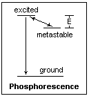 The diagram at the left shows ground and excited states, and also a metastable state an energy E below the excited state. Transitions can occur easily between the excited and metastable states, the differences in energy appearing as lattice vibrations (phonons), as well as between the excited and ground state, with the emission of a photon. While the excitation is active, the excited and metastable states reach an equilibrium. At moderate temperatures, it is more likely that an electron will fall into the metastable state than leave it, because of the activation energy E, so the metastable states generally fill up. When the excitation is removed, the only source of electrons in the excited state are electrons boosted up by thermal energy from the metastable state. When they reach the excited state, they quickly emit a photon and fall to the ground state. This is the phosphorescent radiation, that continues as long as electrons are available from the metastable states. Chemists, with their limited viewpoint, call this "delayed fluorescence," reserving phosphorescence for a direct radiation from the metastable state, but this is not a useful general distinction, because of the variety of mechanisms. The higher the temperature, the more readily the electrons can reach the excited state, and so the shorter the time that the phosphorescence persists. That is, phosphorescence, under this model, is temperature-dependent, in contrast to the previous case with no metastable states, which is temperature-independent. Therefore, fluorescence and phosphorescence are usually distinguished by their temperature dependences, rather than from an arbitrary choice of limiting time constant. As we see, this applies to organic molecules as well as to crystals, though the detailed mechanism is different.