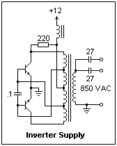 The power supply is a push-pull oscillator running at 20-40 kHz. The reverse-engineered circuit diagram is shown at the right. The operation depends on the details of the transformer, which I do not know, so this circuit is for information only. Measurements while it is in operation may help to understand it better. The output is taken from the secondary of a small transformer, and provides 10 mA at about 850 V. +12 V is applied to terminal 1, and ground to terminal 2 (be very careful to get the polarity correct). There are two output terminals (3 and 4), each coupled through a 27 pF capacitor, and one common terminal (5). Using one output terminal, with the other connected directly with the common terminal, is satisfactory for a 5 mA load (such as the UV-350). The two outputs can be used for two 5 mA loads, one for each output, or a 10 mA load can be connected to the two terminals in parallel. This high-voltage supply is not as lethal as the DC supplies we used for the oscilloscope and photomultiplier, but should still be treated with respect. The absence of large capacitors charged to high voltages is one reason for the relative safety, and the high frequency also helps (skin effect). This little power supply could be made the basis of a low-current DC supply by adding a rectifier and capacitor, but then would become more lethal.