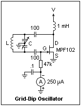 The idea is to have a variable-frequency oscillator that is oscillating steadily but not too strongly. The gate bias is produced by the DC gate current through the 47k resistor. The stronger the oscillation, the more bias required and the larger the gate current. The supply voltage V is varied until the gate current is a suitable value. In this circuit, I found that 9 V gave a gate current of 200 μA. The principle of making a measurement is to couple the resonant circuit under test to the oscillator coil. When the oscillator and external circuit have the same resonant frequency, losses from the external coil are most effectively reflected into the oscillator tuned circuit, making it resonate less strongly and decreasing the gate current (so that the transistor will give more gain to compensate for the losses). For accuracy, the coupling must not be too tight. The best result is a small but sharp dip when the circuits are in resonance. The frequency is then read off on a calibrated scale.