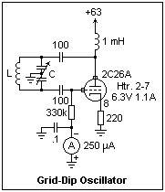 A vacuum-tube grid-dip oscillator is shown at the left. The circuit is very similar to the FET oscillator, but a few of the components had to be changed. The odd 2C26A tube is what was at hand when the oscillator was constructed; any triode can be used. The 220 Ω resistor in the cathode lead makes it possible to measure the DC plate current, and provides some cathode bias to protect the tube. The 47k grid leak is replaced by 330k, since the 2C26 requires much greater grid bias. Full scale on the meter corresponds to a grid bias of -82 V. This circuit oscillated very strongly at the lower frequencies, but because of poor lead dress slipped into another mode at the minimum capacity. At any rate, it oscillated from 878 kHz to 1.7 MHz, and gave a good dip when a resonant circuit was coupled to it.