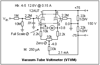 Like the VOM, the VTVM had DC and AC voltage scales, but usually did not measure current or resistance. A typical VTVM circuit is shown at the right, adapted from the 1954 ARRL Amateur Radio Handbook, p. 461. It uses a 12AU7A dual triode, which has μ = 20 and a maximum plate voltage of 300V. Note that the bipolar supply is provided by a voltage divider formed by the 22k, 1/2W resistors, and the input 150V must not be referred to ground. This is a standard differential amplifier circuit, balanced by adjusting the 10k potentiometer. When balanced, about 1 mA plate current flows in each triode when the grids are both at zero potential.