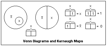 A special form of the Venn diagram is the Karnaugh (K-) map. For one variable x, these are the 2-cell figures shown at the right. Each cell represents an elementary area in the Venn diagram. The cells may also be labelled by the values of the variable, 0 or 1, instead of by the convention shown, and this is usually done in digital design. Each cell may contain a 1 or be left empty, which is equivalent to a 0. The functions x, /x, 1 and 0 can be represented as shown. At this point, the K-maps are only curiosities.